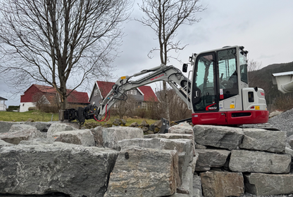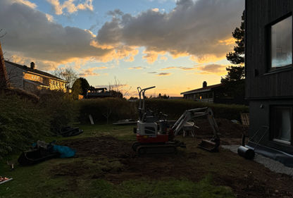 En kjapp jobb hvor overskuddsjord fra utgraving til terrasse planeres og skråning skrapes klar til duk og singel
