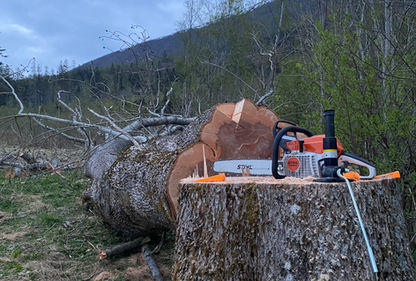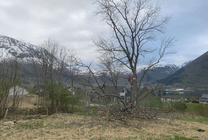 Begge trærne trygt nede på bakken. Jobben med kvisting og kubbing er godt i gang. Her ønsker kunde trærne ferdig oppkubbet slik de kunne kløyve det til ved selv.