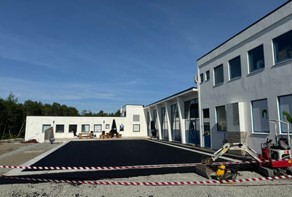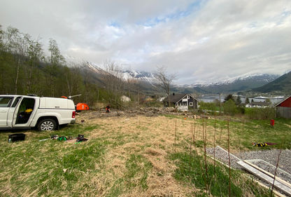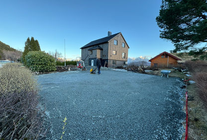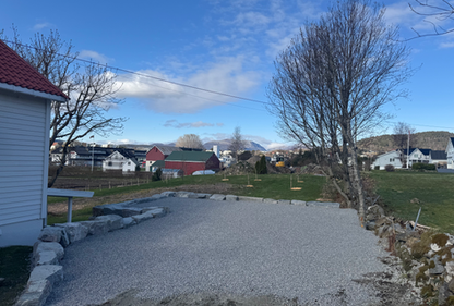 Slik ser det ut nå, kunde har fått stor plass til både firmabil, privatbil og til og med besøk! Grunnarbeidet har vi gjort med en fremtidig garasje i bakhodet. Der er det ikke mye justeringene som skal til før ringmuren kan settes om noen år!
