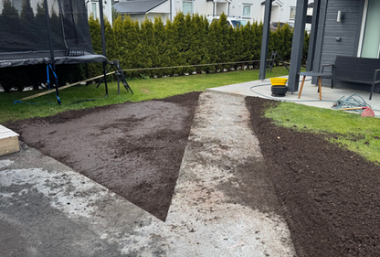 Kunde ønsket jord som var til overs fra utgraving til nybyggd terrasse jevnet ut over uteområdet. Det må vi da selvsagt ordne!